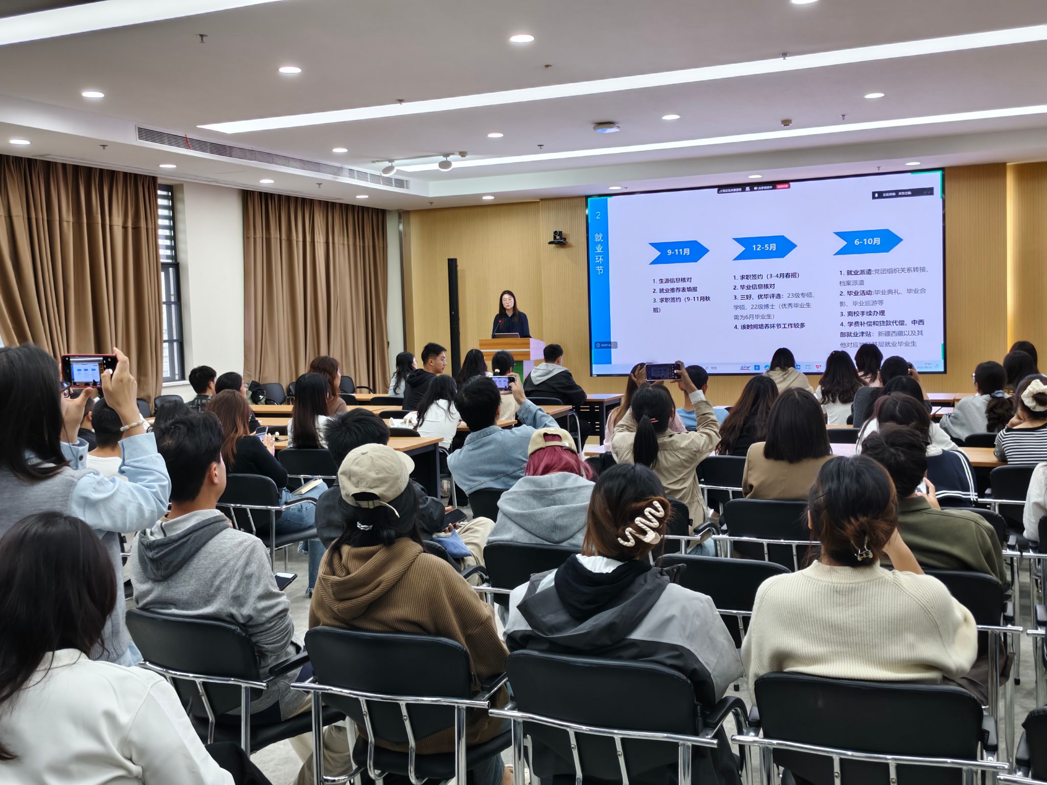 2026届毕业研究生就业动员暨网签培训大会在第三综合楼A705召开,会议由辅导员于姝宁主持,近200名2026届毕业生线上线下参会。