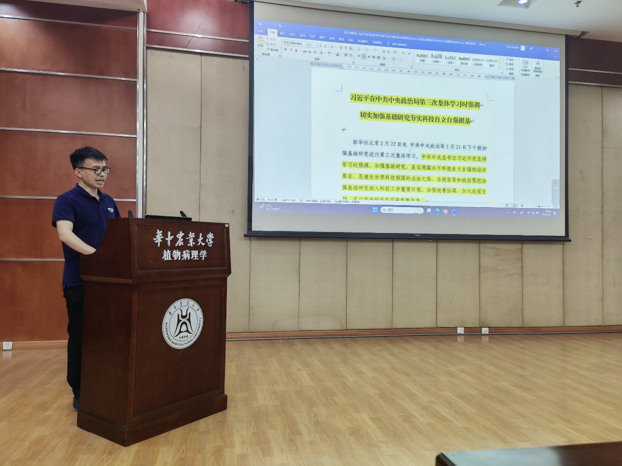 5月4日下午,植物病理教工党支部在分子楼103报告厅开展理论学习主题党日活动,专题学习研讨习近平总书记在中共中央政治局第三次、第四次集体学习时的重要讲话和习近平总书记给中国农业大学科技小院的同学们的回信精神。院长朱龙付和支部成员参加学习研讨,活动由党支部书记谢甲涛主持。
