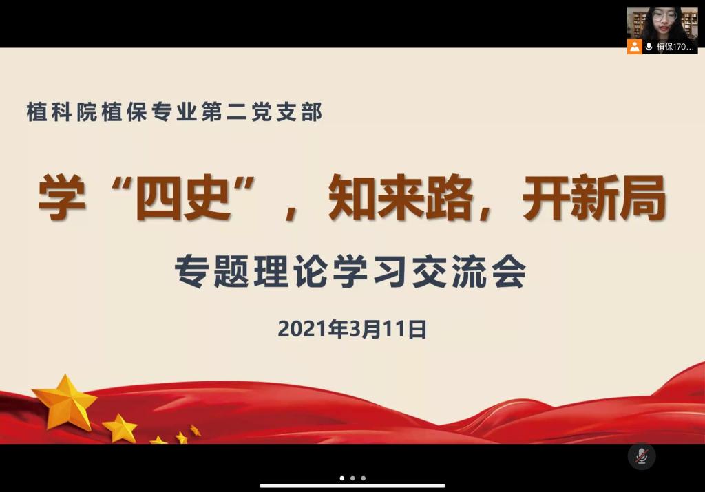 3月11日,植保第二党支部全体成员通过线上形式分享了寒假期间对“四史”的学习情况。党支部书记熊攀攀参加本次活动。党支部以党小组的形式进行学习分享,党支部副书记许承慧主持本次活动。