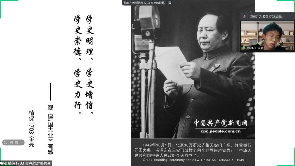 植保第二党支部第一党小组金亮同志通过观看影片《建国大业》体会到了一个国家建立所经历的艰苦历程。“1949年10月1日,北京30万群众齐集天安门广场,隆重举行开国大典,毛泽东在天安门城楼上向全世界庄严宣告:‘中华人民共和国政府今天成立了。’”这是影片中的高潮部分,也是全国人民都熟悉的场景。他还指出,通过整部影片同时联系生活实际,“学史明理、学史增信、学史崇德、学史力行”这一句话并不是说说而已,身体力行才是最重要的。第二党小组贺梦凡同志则简要总结了党小组各成员们的学习情况。