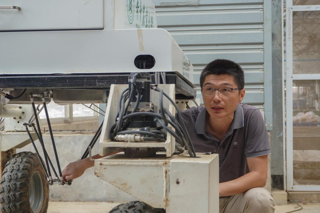 “作物表型平台主要用于作物遗传育种,而农业机器人为作物表型服务。”宋鹏简明扼要地介绍了作物表型平台与农业机器人的关系。紧接着,宋鹏带领同学们参观了田间表型机器人、作物植株表型检测系统、考种机等多种农业机械设备。在现场,一种装有三维机械臂的四轮驱动机器人激发了同学们浓厚的兴趣。宋鹏解释,三维机械臂可以根据实际需要灵活结合相机、刀片、传感器等,在农业机器人上被广泛使用。它可以提取到实时信息,识别出目标作物,进而测量植株高度、氮含量、植株直径等信息。而每个农业机器人背后都蕴藏着科研团队鲜为人知的艰辛。“三年的努力,我十五分钟就给你们讲完了。”宋鹏笑着对大家说。