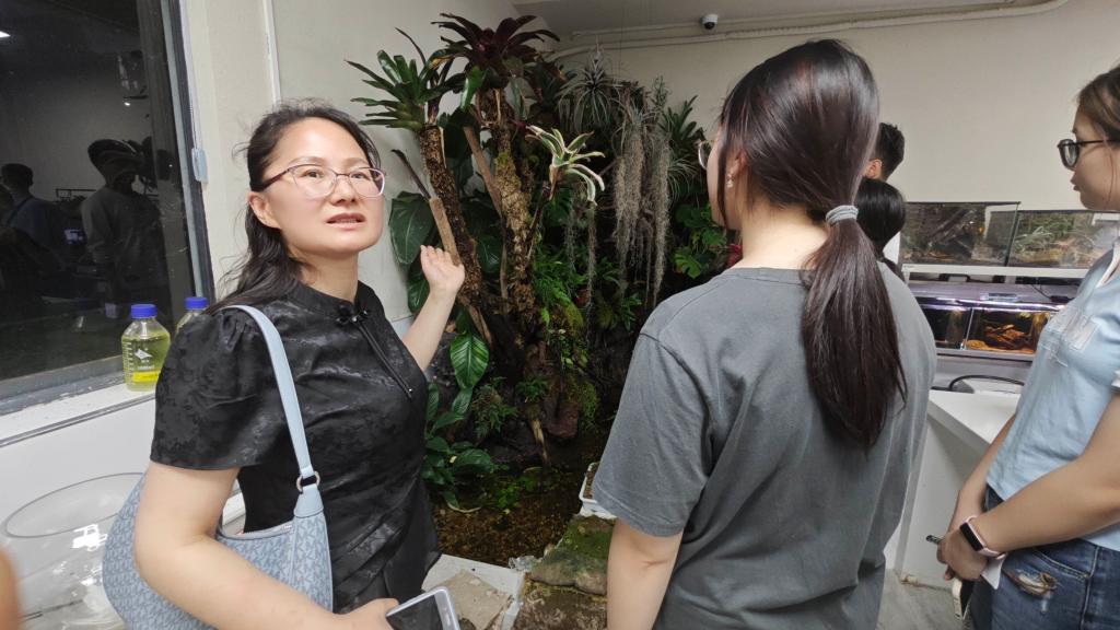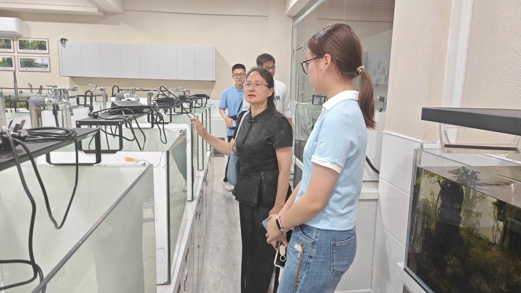 在水族景观规划与设计实验室,透明展示缸里景观鱼和水生植物布景相得益彰,角落水陆布景和模拟热带雨林布景等展示一个又一个水产巧思。王春芳介绍到,学校是水族展览示范点,每年会接待几百个参观团。“今年10月份学校还会举行水族箱布景大赛,欢迎同学们踊跃参加!”王春芳鼓励在场的同学们。