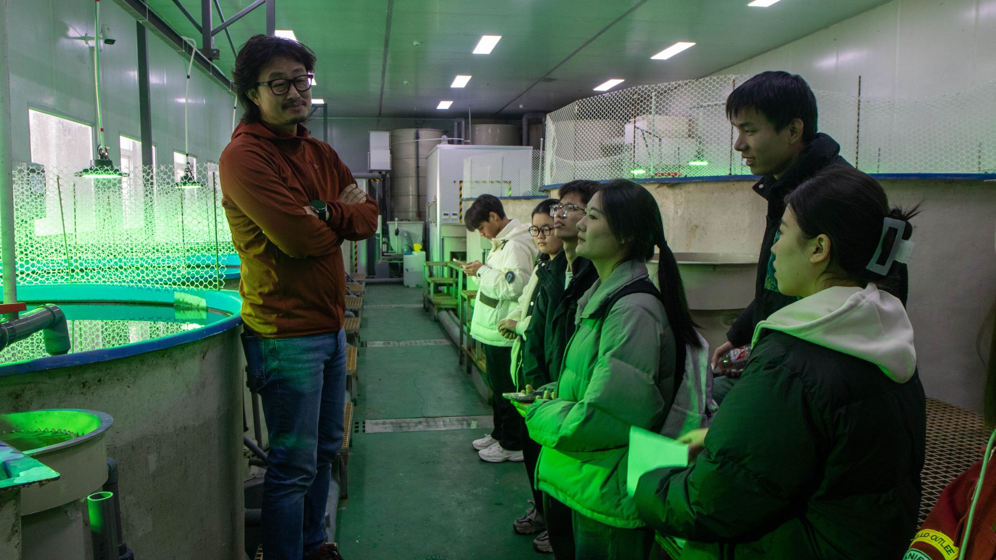 在水产养殖基地,高坚带领同学们近距离观摩工厂化循环水养殖系统,围绕循环水养殖系统的液氧系统、生化处理系统、尾水处理固液分离器等内容为同学们上了一堂生动的智慧渔业微课,并解释了各系统如何协同工作以实现尾水的有效处理与循环利用。面对同学们提出的“养殖基地为什么要使用绿灯?”的问题,高坚解释道:“绿色光谱可以抑制鱼性腺的发育,从而控制养殖密度、提高养殖效益。”