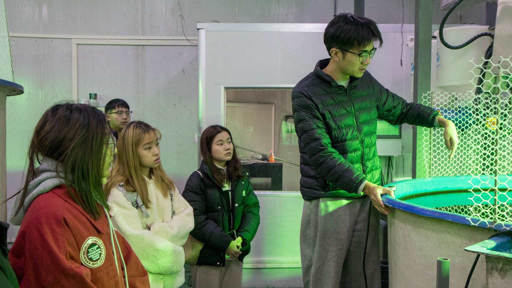 活动最后,研究生朱天一为同学们讲解了环道流水刺激鱼产卵的原理、零排放圈养模式的作用以及精准投饵机的使用方法等内容。他强调,整个水产养殖基地是一个高度集成的网络系统,各个环节相互关联、缺一不可。