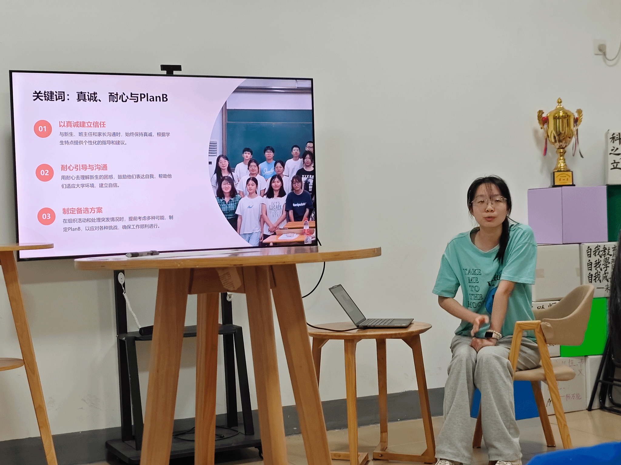 接下来,刘一鸣从9月“开学初期的管理”、10月“班级观察者阶段”和11月“期中考试后的管理”这三个阶段详细向同学们介绍了学生班主任助理的具体工作和工作重点。除此之外,她强调了“真诚”“耐心”和“Plan B”三个工作关键词, “以真诚建立信任—耐心引导与沟通—制定备选方案”,扎实做好学生工作。