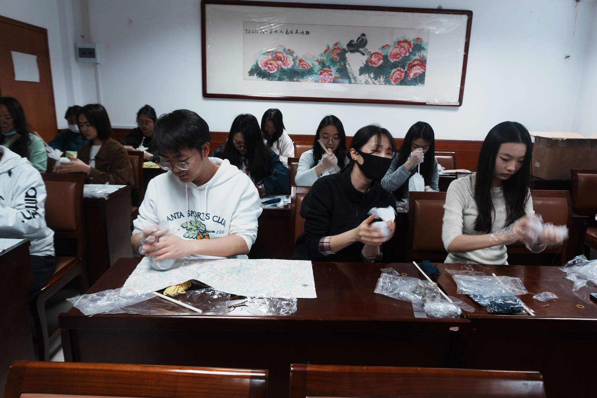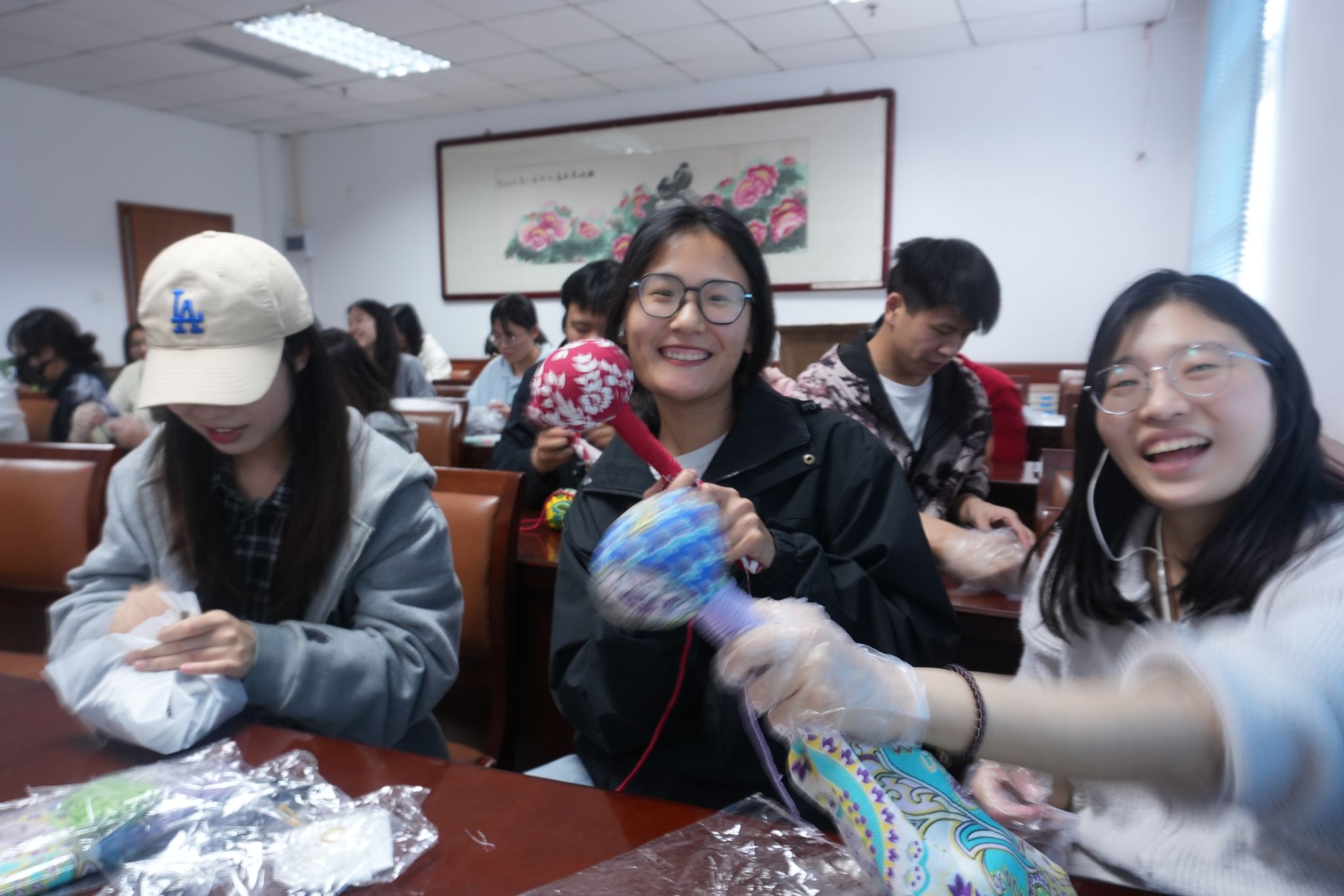 随后,大家领取制作艾草锤的手工材料,其中包括粗布、决明子、艾草包、锤柄、麻绳、橡皮筋等。在整个制作过程中,师生之间配合默契十足。经验丰富的老师耐心地为同学们解答疑惑,分享自己的小技巧;大家一边动手制作,一边分享着科研、学习生活中的趣事。在轻松愉快的氛围里,一个个精美的艾草锤在大家手中诞生。