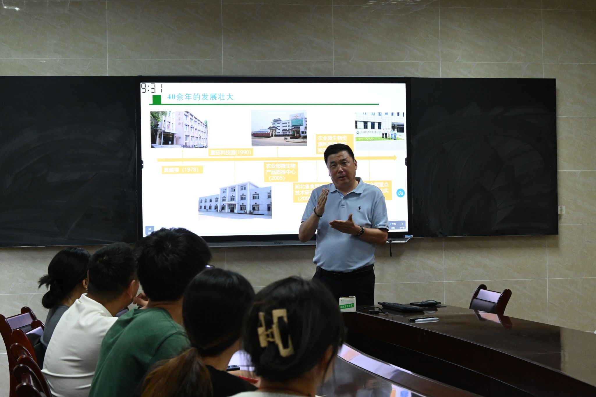 应用真菌研究所所长边银丙教授在真菌楼会议室为大家讲解真菌楼发展史。从研究所的成立背景,到不同阶段的重大事件、卓越科研成果,再到优秀科研团队与学者事迹,带领师生们深入了解这所被誉为 “中国食用菌领域黄埔军校” 的成长历程。40余年来研究所培养了约300余名硕士、博士,为湖北乃至全国食用菌产业培训各类核心专业人才近20000人。边银丙教授表示,“食用菌的未来需要你们。一个产业的发展需要几代人久久为功,要记住‘功成不必在我,功成必定有我’!”
