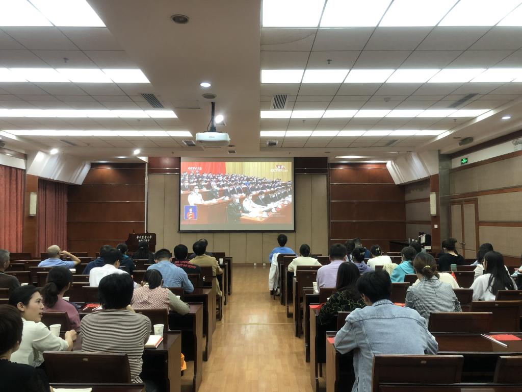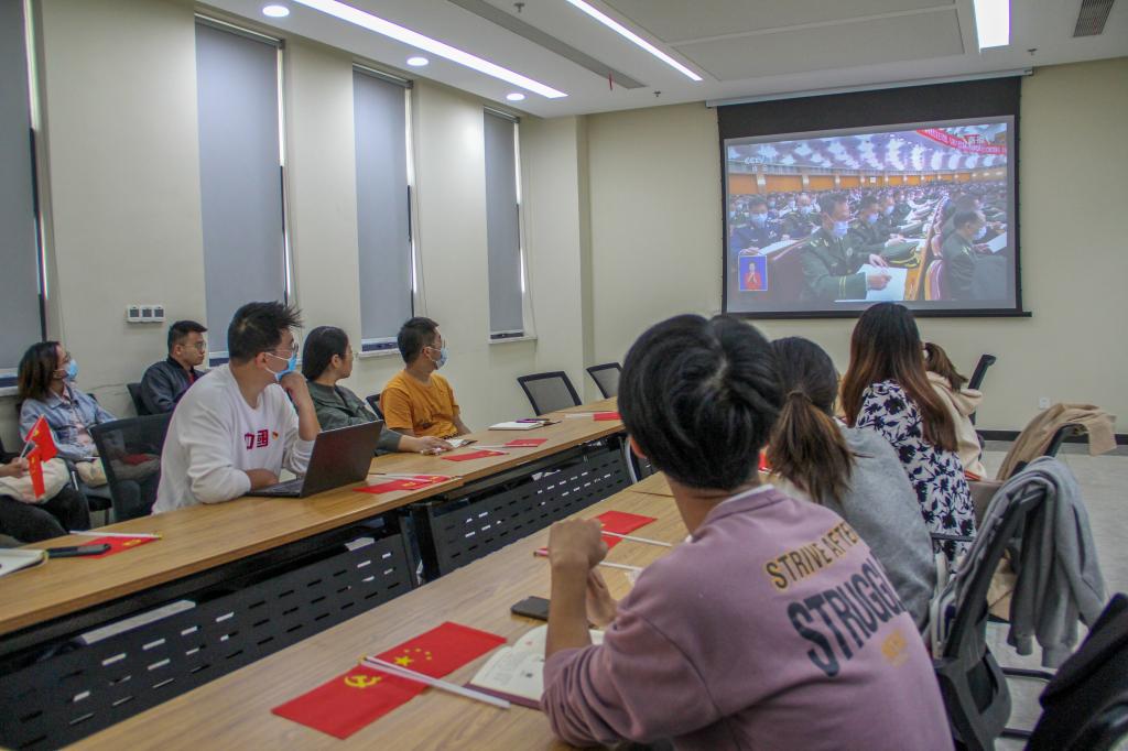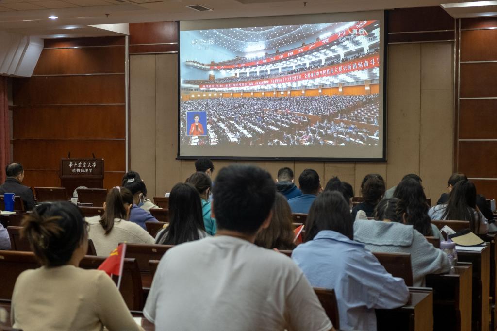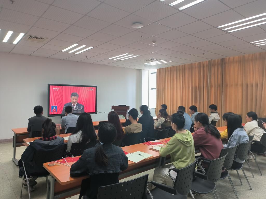教工、学生和离退休党支部师生通过线上线下在9个会场同步收看大会直播,校党委副书记、副校长姚江林在三综A705主会场和师生代表一同观看了开幕式。