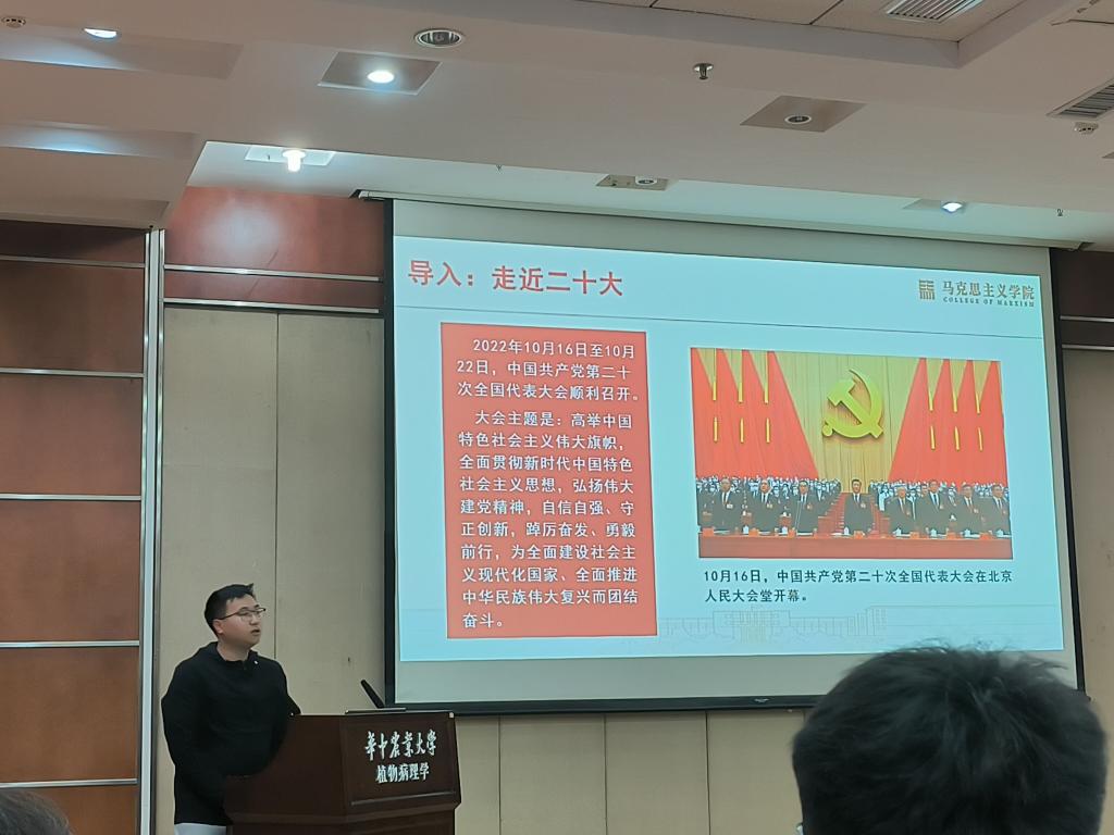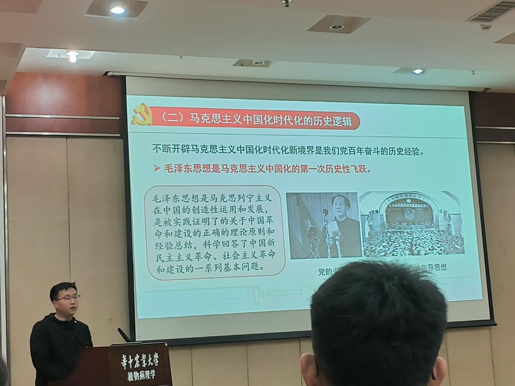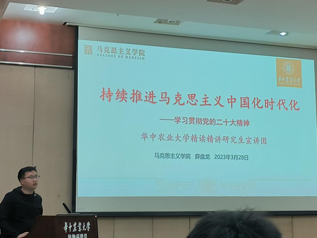 3月28日,植物病理专业研究生第五党支部于分子楼学术报告厅开展党的二十大精神“精读精讲”专题学习暨三月份主题党日活动。91免费版 “精读精讲”研究生宣讲团成员、马克思主义91免费版 薛盘龙同学应邀作题为“持续推进马克思主义中国化时代化学习贯彻党的二十大精神”的学习分享。病理五党支部全体党员参与学习。
